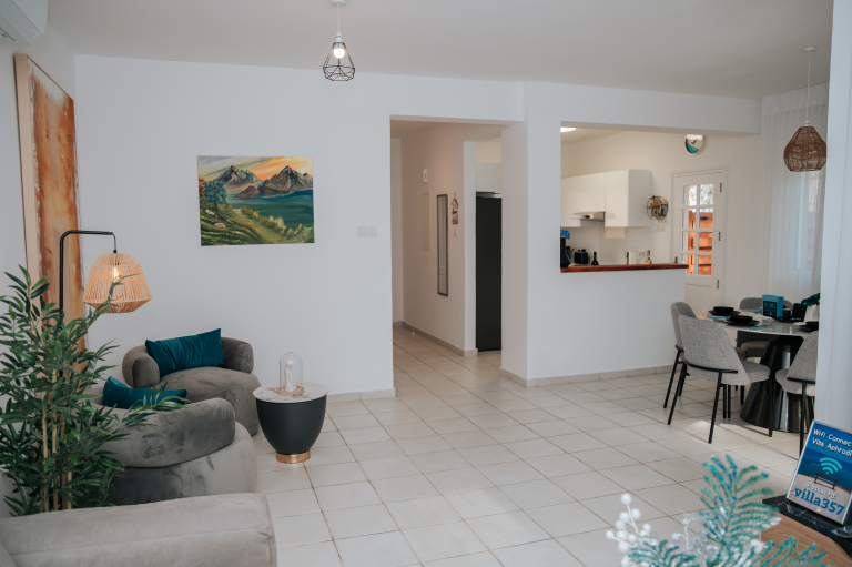A selection of 3 Large bedrooms and a Fully equipped Kitchen. Comfortable 2 bathrooms with fresh clean towels provided. Comfy living area, large sofa, dining table, flat screen smart TV and smart TV in each of the bedrooms, with Free Wi-Fi around the villa, providing you the great holiday home with a premium experience.